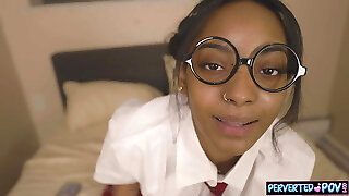 Cherry nerdy girl in glasses gets fucked by a black ample cock in sauna