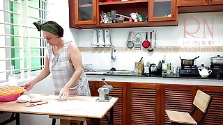Ravioli Time! Naked Cooking. Regina Noir, a nudist cook at naturist hotel resort. Naked maid. Bare housewife. Scene 1