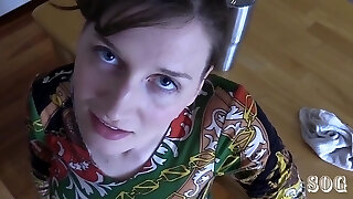 Hot housewife Lukerya in a collar, milky nylon stockings and handcuffs